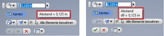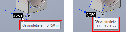 Wenn beim Befehl Bohrung ein Wert ungültig ist, beispielsweise, wenn die angegebene Gewindelänge größer als die Bohrungstiefe ist, wird der Wert rot angezeigt, und in der QuickInfo wird der Wert als ungültig angegeben, wenn Sie ihn eingeben. Dadurch können Sie den Wert sofort korrigieren oder einen anderen Wert suchen, der geändert werden muss, damit dieser Wert gültig wird. Wenn ein Wert gültig ist, wird er schwarz angezeigt.
