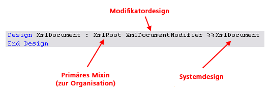 ETO stellt Modifikator-Designs bereit, mit denen Sie das Vorgabeverhalten von Systemdesigns ändern können. Das Modifikator-Vorgabedesign kann nicht bearbeitet werden. Sie müssen eine Kopie dieses Designs (mit demselben Namen) als Benutzerdesign erstellen, das Sie anschließend bearbeiten können. Der Name des Modifikator-Designs wird wie im folgenden Beispiel nach dem primären Mixin in der Designdeklaration angezeigt: