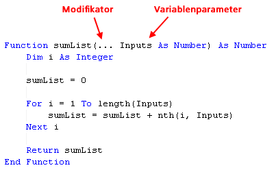 Im folgenden Beispiel ist eine Funktion dargestellt, die einen Variablenparameter des Typs Zahl aufweist. Argumente, die über einen Funktionsaufruf bereitgestellt werden, müssen vom Typ Zahl oder Ganzzahl sein.