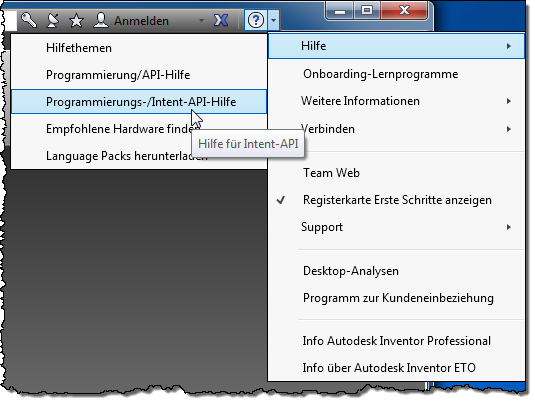 Wie bei Inventor ist die Dokumentation der Intent-API vorgabemäßig lokal im Verzeichnis C:\Programme\Autodesk\Inventor ETO Components 2016\Help\IntentAPI.chm installiert. Sie können diese Datei, wie nachfolgend abgebildet, direkt in Inventor über das Hilfemenü öffnen.