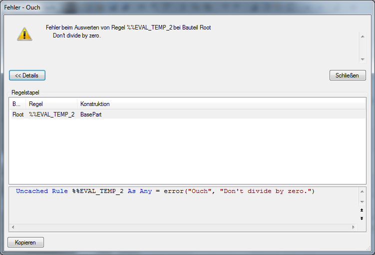 Generiert einen Fehler mit der bereitgestellten Zeichenfolge als Fehlermeldung. Der Fehler ist wie alle integrierten Sprachfehler für die aktuelle Berechnung schwerwiegend. Die tatsächliche Auswirkung des Fehlers hängt von der Umgebung ab, in der die Regeln ausgeführt werden. In Inventor sehen Sie ein normales Fehlerbehandlungsfenster wie in den Beispielen dargestellt. In benutzerdefinierten Benutzeroberflächen bestimmt diese, auf welche anwendungsspezifische Weise der Fehler angezeigt wird.