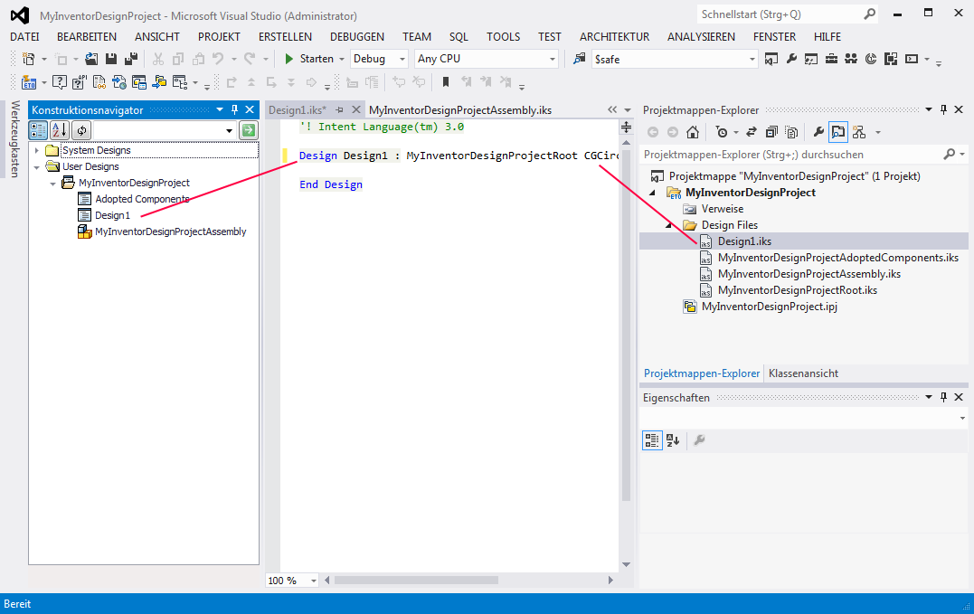 Der Designnavigator in Visual Studio stimmt im Wesentlichen mit dem Design-Editor überein, abgesehen von einigen Ausnahmen. Der größte Unterschied besteht darin, dass die Benutzerdesigns die im Visual Studio-Projekt geladene Projektdatei wiedergeben. Eine Ausnahme von diesem Arbeitsablauf besteht darin, dass Inventor die Suche von Designs in anderen Inventor-Projekten unterstützt. In diesem Fall sehen Sie die referenzierten Designs in den Benutzerdesigns, jedoch nicht in Ihrem Projekt.