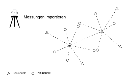 In einer Messungsgruppe importieren Sie z. B. mehrere Tachymeterdateien mit einer Polaraufnahme. In einer anderen Messungsgruppe importieren Sie mehrere GPS-Sitzungen.