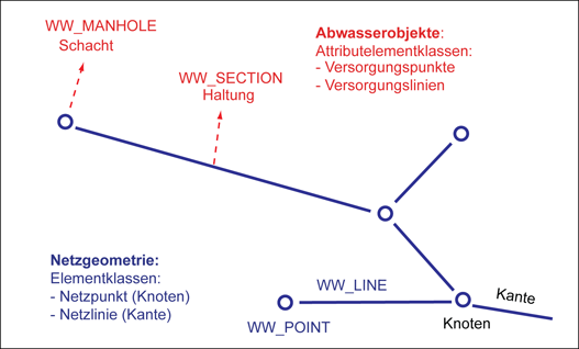 Abwasser basiert auf dem Versorgungsnetzwerk-Datenmodell, in dem Geometrie- und Attributdaten separat gespeichert werden. Das Datenmodell umfasst Themen, Darstellungen, Domänen, Versorgungsnetzwerke, Topologien und Verschnitte.