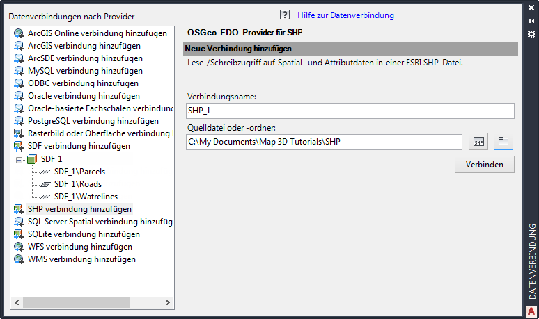 Erstellen Sie einen neuen, leeren Ordner, in dem die SHP-Dateien abgelegt werden sollen. Um die Daten in das SHP-Format zu konvertieren und zu kopieren, muss eine Verbindung zu diesem Ordner hergestellt sein. Mit Datenverbindung stellen Sie Verbindungen zu Datenspeichern her, selbst wenn Sie keine Elemente aus dem Datenspeicher in die Karte einfügen.