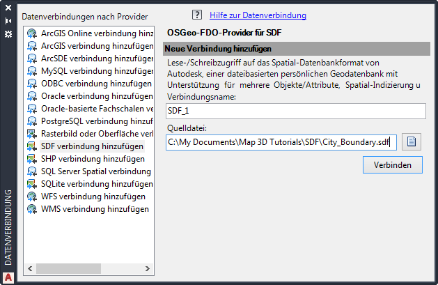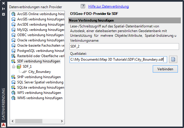Wählen Sie den SDF-Provider aus, und navigieren Sie zur Beispieldatei CITY_BOUNDARY.SDF.