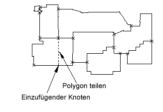 Die Bearbeitungen an dieser Flächentopologie bestehen im Hinzufügen eines Knotens und dem anschließenden Teilen des Polygons durch eine Verknüpfung.