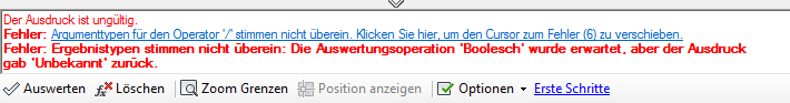 Wenn Sie einen Ausdruck speichern, wird jeweils eine Prüfung durchgeführt, um seine Gültigkeit sicherzustellen. Sie können die Gültigkeit des Ausdrucks auch vor dem Speichern prüfen.