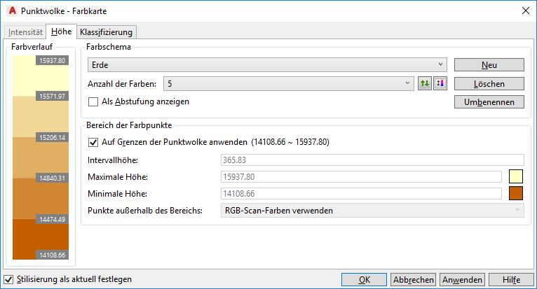 - Klicken Sie in im Dialogfeld Punktwolke - Farbkarte auf die Registerkarte Intensität oder Erhebung.