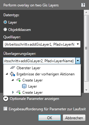 Jeder Arbeitsschritt in einem Arbeitsablauf weist eine Reihe von Parametern auf. Sie haben die Möglichkeit, Vorgaben festzulegen und anzugeben, dass zur Laufzeit des Arbeitsablaufs entsprechende Eingabeaufforderungen angezeigt werden. Die Person, die den Arbeitsablauf ausführt, kann dann die Vorgabewerte durch andere Werte ersetzen. Beispiel: Sie können Vorgabe-Datenspeicher für eine Überlagerung festlegen, die dann von anderen Benutzern bei der Ausführung des Arbeitsablaufs durch andere Datenspeicher ersetzt werden können.