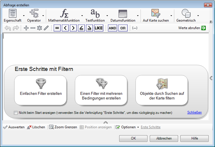 Die Titelleiste des Dialogfelds, in dem Sie Ausdrücke erstellen, unterscheidet sich je nach dem ausgewählten Befehl. Der Inhalt des Dialogfelds bleibt im Wesentlichen gleich (unabhängig vom Aufruf).