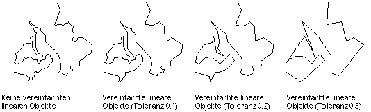 Mit der Option Objekte vereinfachen können Sie komplexe Polylinien durch Entfernen aller inneren Knoten vereinfachen, die in die angegebene Toleranzbreite fallen. Polyliniensegmente, die in denselben Korridor fallen, werden in eine einzige Polylinie zusammengeführt. Verzweigungen, lose Enden und Endpunkte von Polylinien werden nicht zusammengefasst.