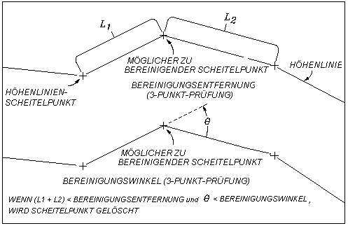 Ein Punkt auf der 3D-Polylinie wird bereinigt, indem seine Position in Bezug auf die Scheitelpunkte vor und nach dem Punkt berechnet wird. Wenn die Länge zwischen diesen drei Punkten geringer ist als der Bereinigungslängenwert und der Richtungsänderungswinkel kleiner ist als der Bereinigungswinkelwert, wird der Mittelpunkt nicht zur Höhenliniendatendatei hinzugefügt.
