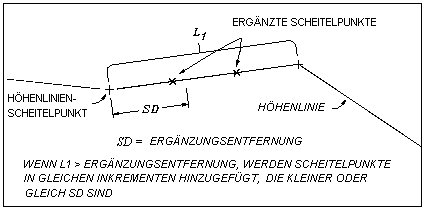 Verwenden Sie Beitragende Faktoren, um Scheitelpunkte entlang 3D-Polylinien zu ergänzen oder hinzuzufügen. Die Ergänzungsentfernung ist die maximale Entfernung zwischen Scheitelpunkten. Ist die Entfernung zwischen Scheitelpunkten auf einer Höhenlinie größer als der Ergänzungsfaktor, werden Punkte entlang der Höhenlinie in gleichmäßigen Intervallen, die entweder kleiner als die Ergänzungsentfernung oder gleich groß sind, hinzugefügt. Je geringer die Entfernung, desto größer die Anzahl der ergänzten Punkte.