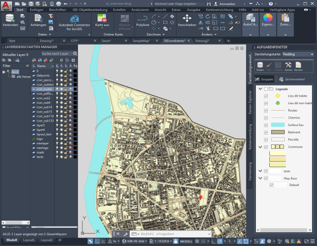 Diese Karte enthält AutoCAD-Layer (links) und Layer der Darstellungsverwaltung (rechts).