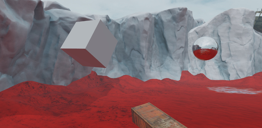For example, in the image below, the reflection probe (the sphere on the right) is placed so that it picks up the red ground and the white/blue sky. Once the reflection probe is baked and set up in the shading environment, all the objects in the scene, like the floating cube on the right, pick up some of the red color on their undersides and the white/blue color on their upper faces: