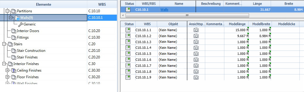 Wenn ein Element oder eine Gruppe geändert wird, wird ein farbiges Dreieck in der geänderten Zelle angezeigt, und in der Spalte Status wird ein Symbol angezeigt. Die folgenden Benachrichtigungen werden in der Spalte Status der Quantifizierungsarbeitsmappe angezeigt.