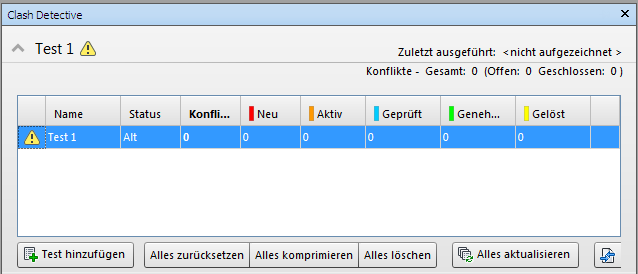 Clash Detective angezeigt werden, indem auf die Schaltfläche zum Erweitern geklickt wird. Alle derzeit eingerichteten Konflikttests werden in Tabellenform angezeigt, sowie eine Zusammenfassung der Status aller Konflikttests.