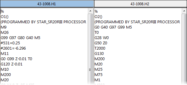 When multiple NC Program files each contain a separate channel, PartMaker shows each file in its own channel. For example, the two files below, H1 and H2, are each shown in their own channel: