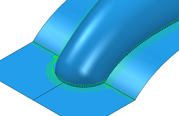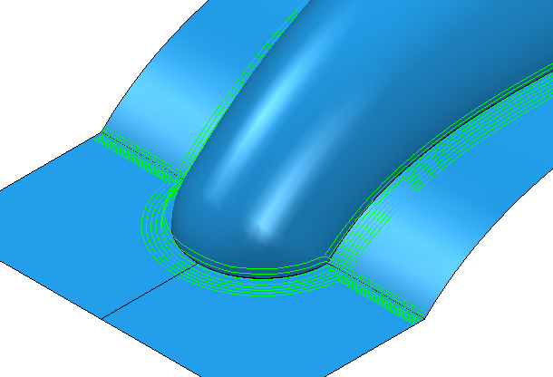 Use the Corner finishing page to create a multiple trace toolpath to clean up corners that occur between non-tangential surfaces. Using the Style setting, you can specify whether the toolpath follows the trace lines or cuts across them. The Corner Detection page determines the extents of the toolpath.