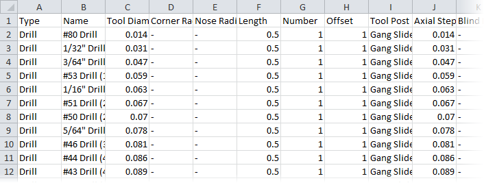 The .csv file contains a single, continuous list of tools, including the tool parameters for each tool. If a particular parameter is not relevant for a tool, a dash (–) is shown. For example: