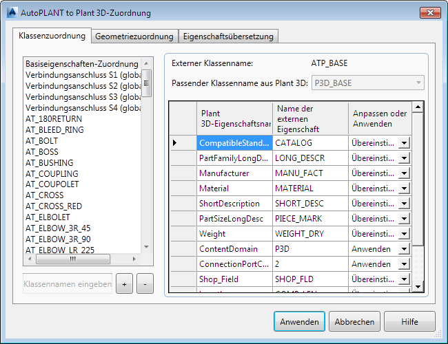 Ermöglicht die Zuordnung von globalen und einzelnen AutoPLANT-Klasseneigenschaften zu ihren Plant 3D-Entsprechungen.