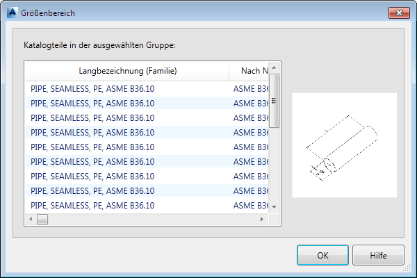 Zeigt alle Teilgrößen für eine Teilgruppe (Teilfamilie) an, wenn der Katalog im Rohrklassen-Editor durchsucht wird.