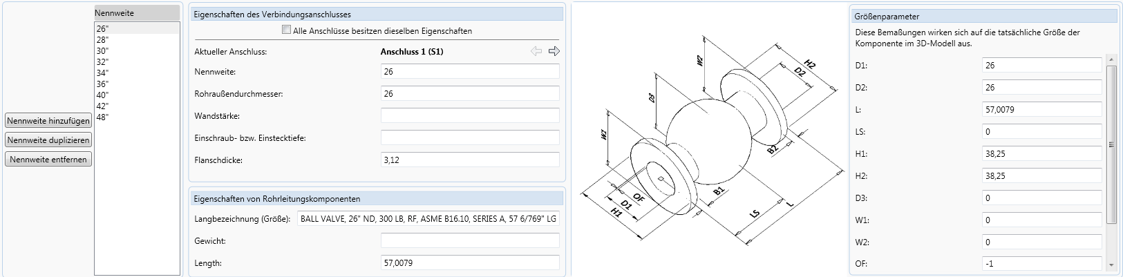 Kopiert die Eigenschaften und Bemaßungen der in der Größenliste ausgewählten Größe. Die neue Größe wird als Nicht definiert angezeigt, bis ihr eine eindeutige Nennweite zugewiesen wurde.