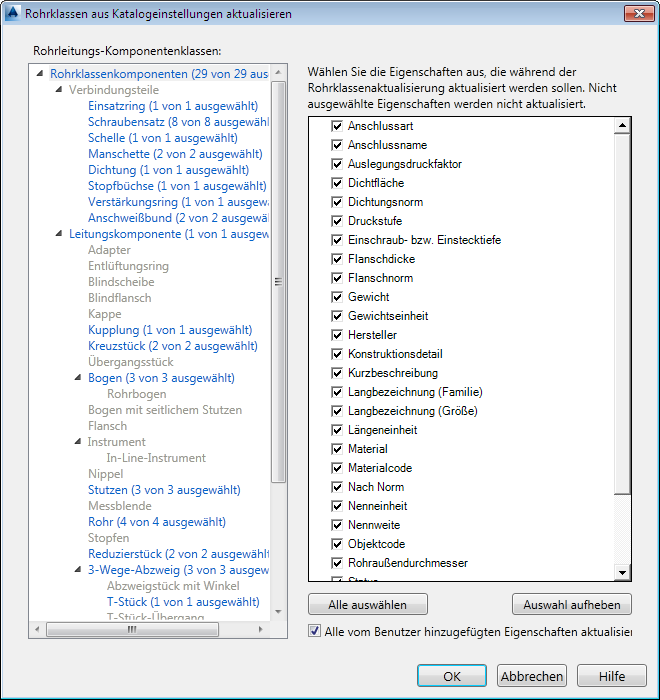 Gibt an, welche Eigenschaften aus dem Katalog während einer Rohrklassenaktualisierung aktualisiert werden.