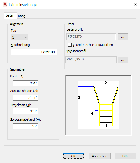 Gibt die Standardkäfigeinstellungen für das Erstellen von Leitern an.