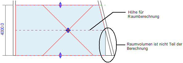 Ist die Volumenberechnung aktiviert, zeigt Revit die tatsächlich für die Berechnung des Raumvolumens verwendeten Begrenzungen an. Dazu gehören auch geneigte Elemente, was z. B. bei Wänden, der Decke oder dem Dach der Fall sein kann.
