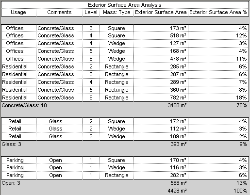 In diesem Beispiel sind die Außenflächen einiger Körpergeschosse (z. B. für den quadratischen Körper auf Ebene 4 und den keilförmigen auf Ebene 6) größer als diejenigen anderer Körpergeschosse, da sie anders berechnet werden.