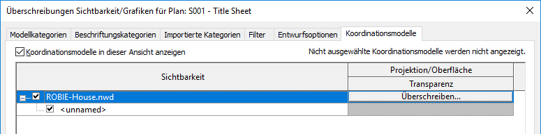 Die Registerkarte Koordinationsmodelle im Dialogfeld Sichtbarkeit/Grafiken enthält die folgenden Einstellungen: