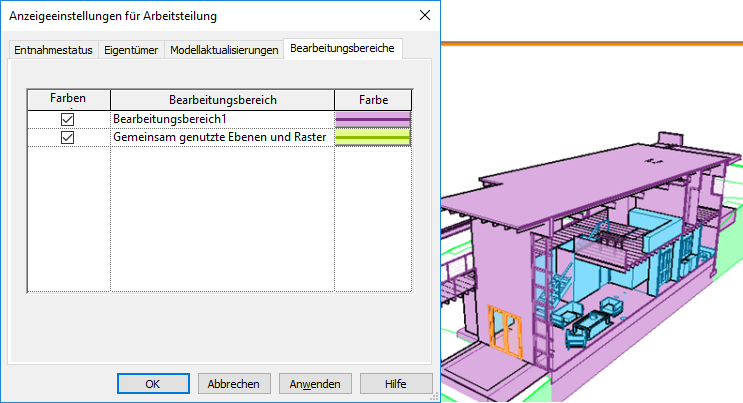 Sie können Bearbeitungsbereiche in einem Projekt mit Arbeitsteilung visuell unterscheiden.