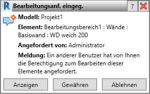 Um die Kommunikation beim Arbeiten mit Projekten mit Arbeitsteilung zu erleichtern, erhalten Teammitglieder eine automatische Benachrichtigung, wenn Anfragen zum Entleihen von Elementen gestellt, gewährt und verweigert wurden.