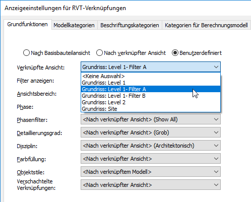 - Gehen Sie im Dialogfeld Anzeigeeinstellungen für RVT-Verknüpfungen auf der Registerkarte Grundfunktionen wie folgt vor: