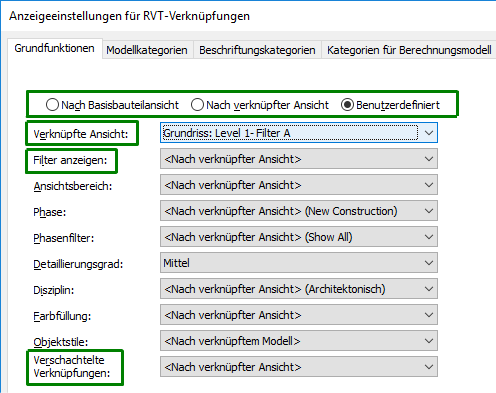 Um die Verwendung von Filtern für verknüpfte Modelle in einer Basisbauteilansicht zu steuern, verwenden Sie die Einstellungen im Dialogfeld Anzeigeeinstellungen für RVT-Verknüpfungen.
