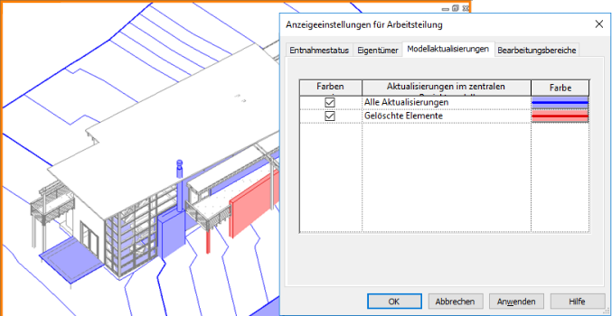 Die angegebene Farbe wird im Modell für die entsprechenden Aktualisierungen oder gelöschten Elemente angezeigt.