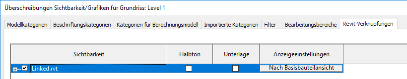 Wenn Nach Basisbauteilansicht nicht angezeigt wird, klicken Sie in die Spalte Anzeigeeinstellungen. Wählen Sie im Dialogfeld Anzeigeeinstellungen für RVT-Verknüpfungen auf der Registerkarte Grundfunktionen die Option Nach Basisbauteilansicht, und klicken Sie auf OK.