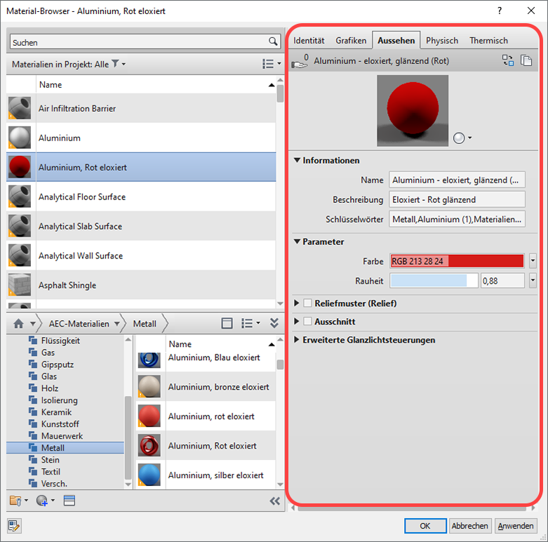 Diese Informationen werden im Material-Browser im Bereich Material-Editor auf den Registerkarten ID, Grafiken und Darstellung angezeigt.