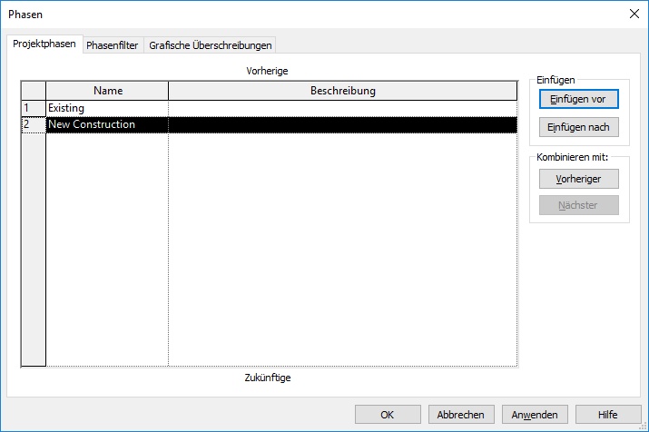 Das Dialogfeld Phasen wird geöffnet und die Registerkarte Projektphasen angezeigt. Standardmäßig verfügt jedes Projekt über die Phasen Vorhanden und Neue Konstruktion.