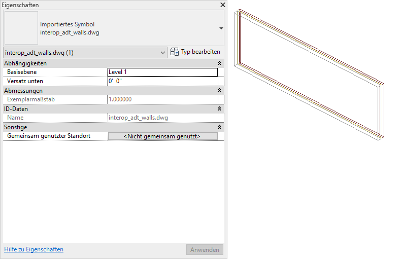 Die folgenden Eigenschaften werden der importierten Wand hinzugefügt: