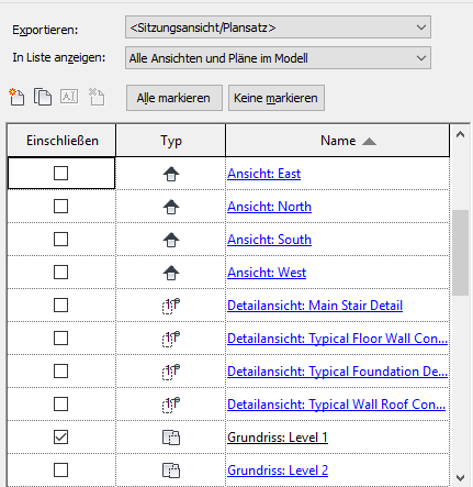 Verwenden Sie beim Exportieren eines Modells in verschiedene Formate die Werkzeuge im Dialogfeld Exportieren, um die einzubeziehenden Ansichten und Pläne auszuwählen. Speichern Sie den ausgewählten Satz zur späteren Wiederverwendung.