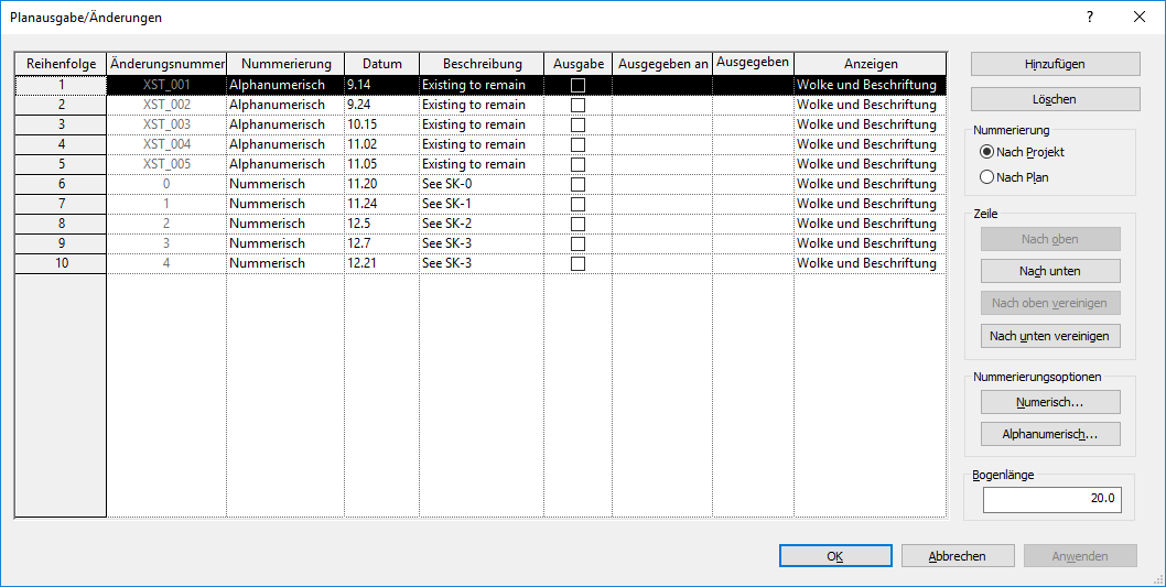 Sie können ein Projekt mit einer bestimmten Nummerierungsmethode (z. B. nummerisch) beginnen. Es ist möglich, die Methode später zu wechseln, um eine neue Projektphase als solche zu kennzeichnen. Die im Dialogfeld Planausgaben/Änderungen unter Reihenfolge angegebenen Nummern geben die Gesamtreihenfolge aller Änderungen im ganzen Projekt an, unabhängig von den im Einzelfall verwendeten Nummerierungsmethoden.