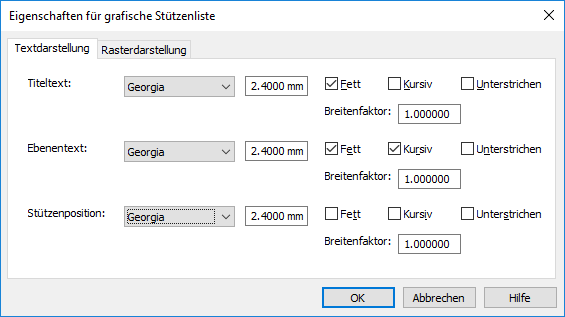 Sie können die Textformatierung in der grafischen Stützenliste anpassen. Klicken Sie in der Eigenschaftenpalette im Abschnitt Text in der Zeile Textdarstellung auf die Schaltfläche Bearbeiten.