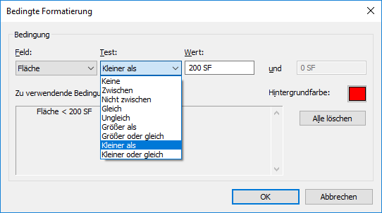 Beispiele für die Verwendung der bedingten Formatierung sind eine Bedingung, mit der angezeigt wird, dass der Flächeninhalt eines Bereichs einen gegebenen Mindestwert unterschreitet oder ob alle Räume im Modell mit der richtigen Menge Luft versorgt werden.