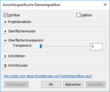 Das Dialogfeld Ansichtsspezifische Elementgrafiken wird zeigt die aktuellen Einstellungen für Sichtbarkeit und grafische Darstellung für das Element an. Erweitern Sie jeden Abschnitt, um seine Einstellungen zu sehen.