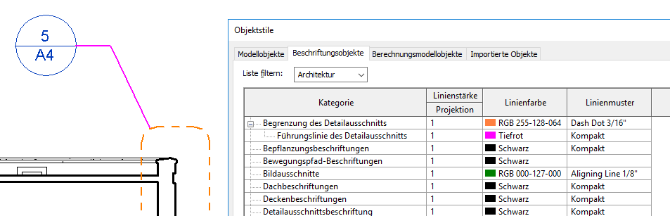 Sie können Linienstärke, Farbe und das Muster von Detailausschnittsbeschriftungsblöcken und Führungslinien ändern. Die hier angegebenen Einstellungen gelten für alle Detailausschnitte des Projekts.