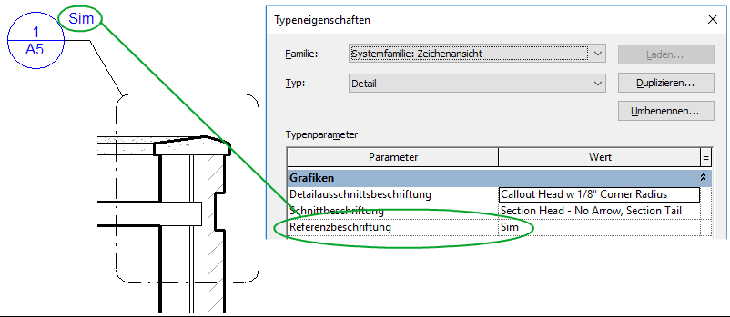 Standardmäßig enthält die Detailausschnittsbeschriftung eines Referenzdetailausschnitts eine Beschriftung wie z. B. Ähnl., eine Abkürzung von Ähnlich). Diese Beschriftung können Sie je nach Projekterfordernis bzw. Unternehmensvorgabe ändern. Sie können z. B. Spiegeln oder Umkehren als Referenzbeschriftung verwenden.