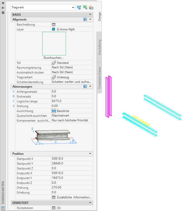 Die Tragwerksteile können Sie bei Bedarf in AutoCAD Architecture bearbeiten. Weitere Informationen finden Sie unter "Tragwerksteile" in der AutoCAD Architecture-Hilfe.